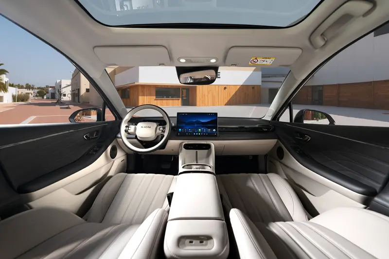 內飾方面,新車(chē)延續了埃安家族簡(jiǎn)約的設計,車(chē)內用料非常講究,中控扶手、儀表臺、四門(mén)飾板等高頻接觸區域 100%皮質(zhì)軟包覆,座椅采用專(zhuān)屬研發(fā)的高檔細膩(纖柔紋)皮質(zhì)材料。同時(shí),新車(chē)標配ADiGO6.0智能座艙,并配備華為最新版HiCar4.0 手車(chē)互聯(lián)。